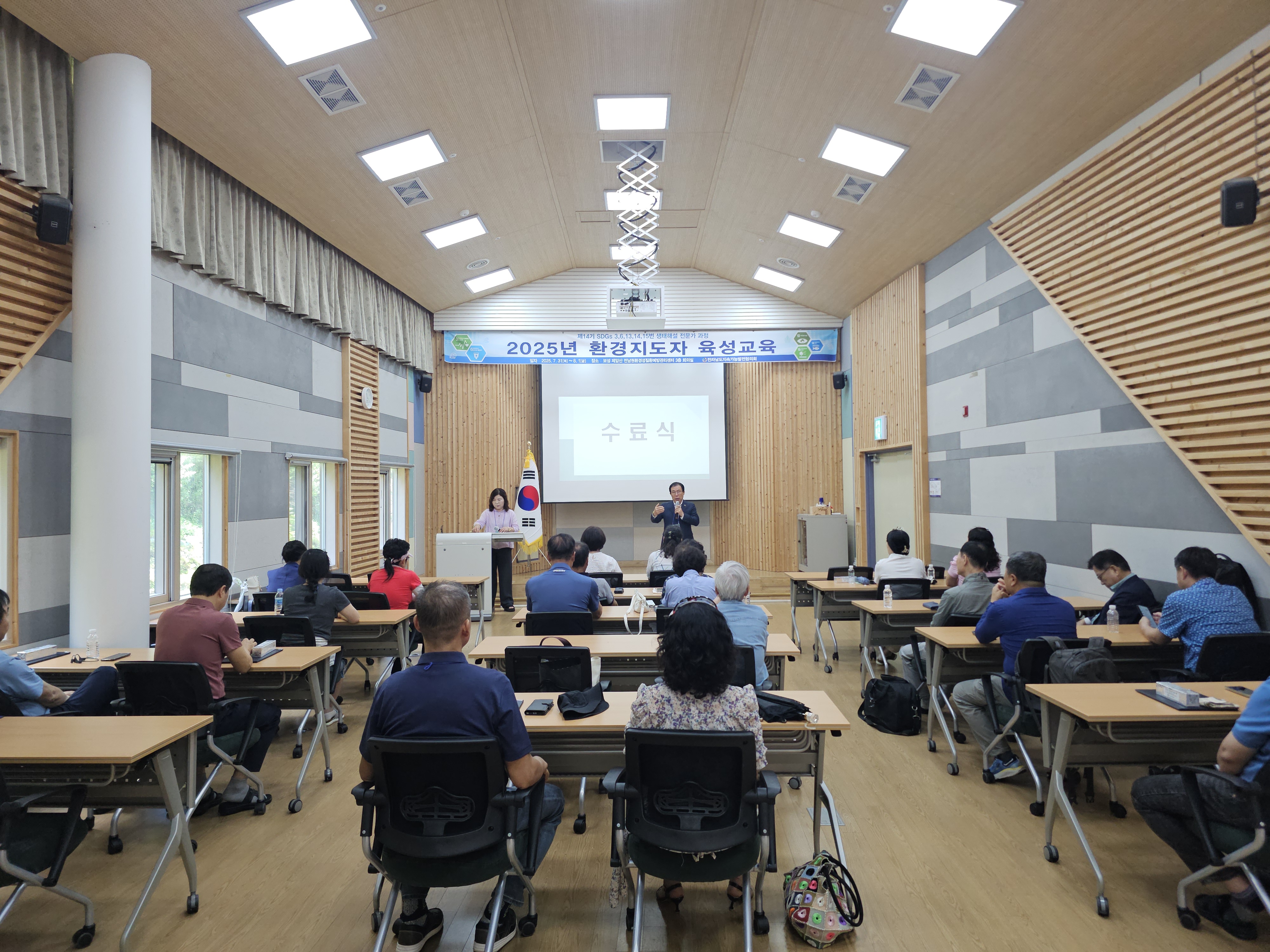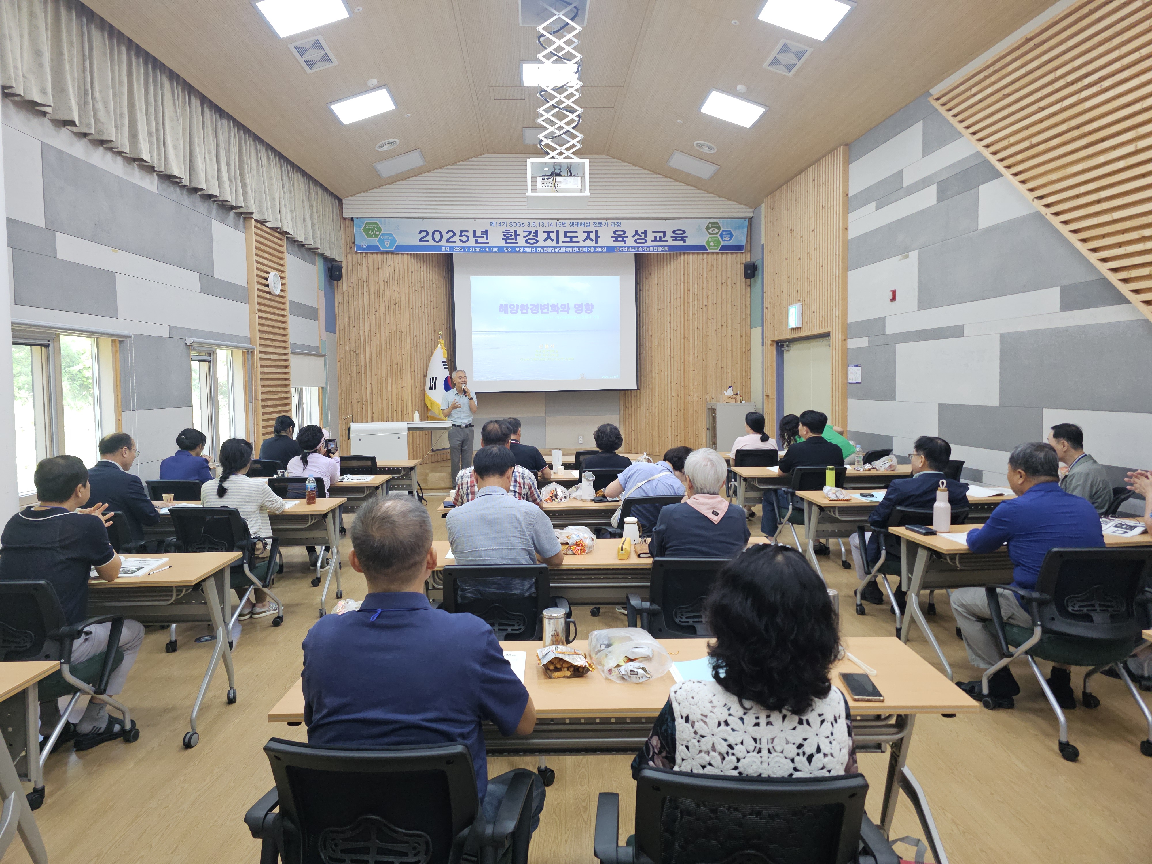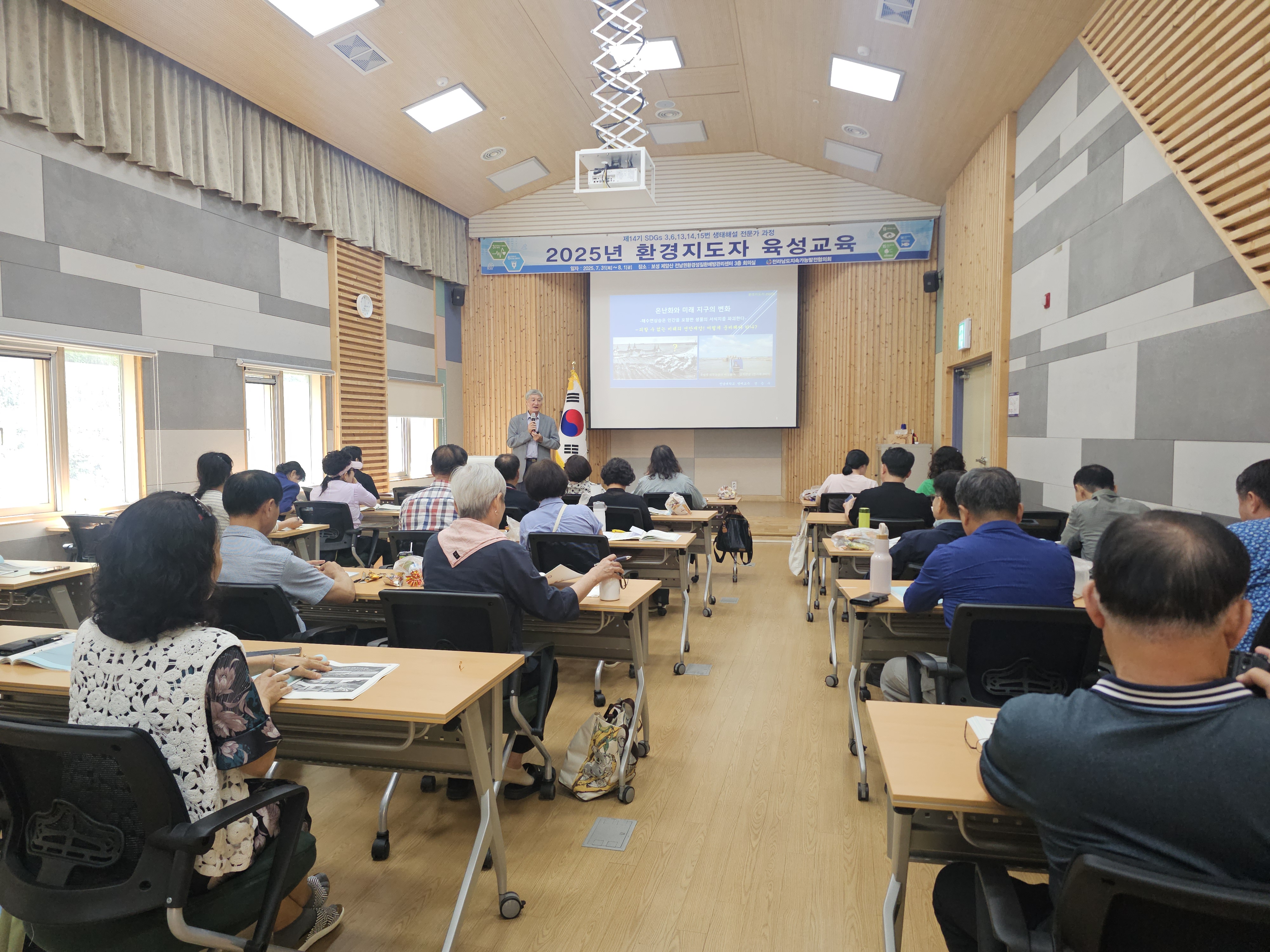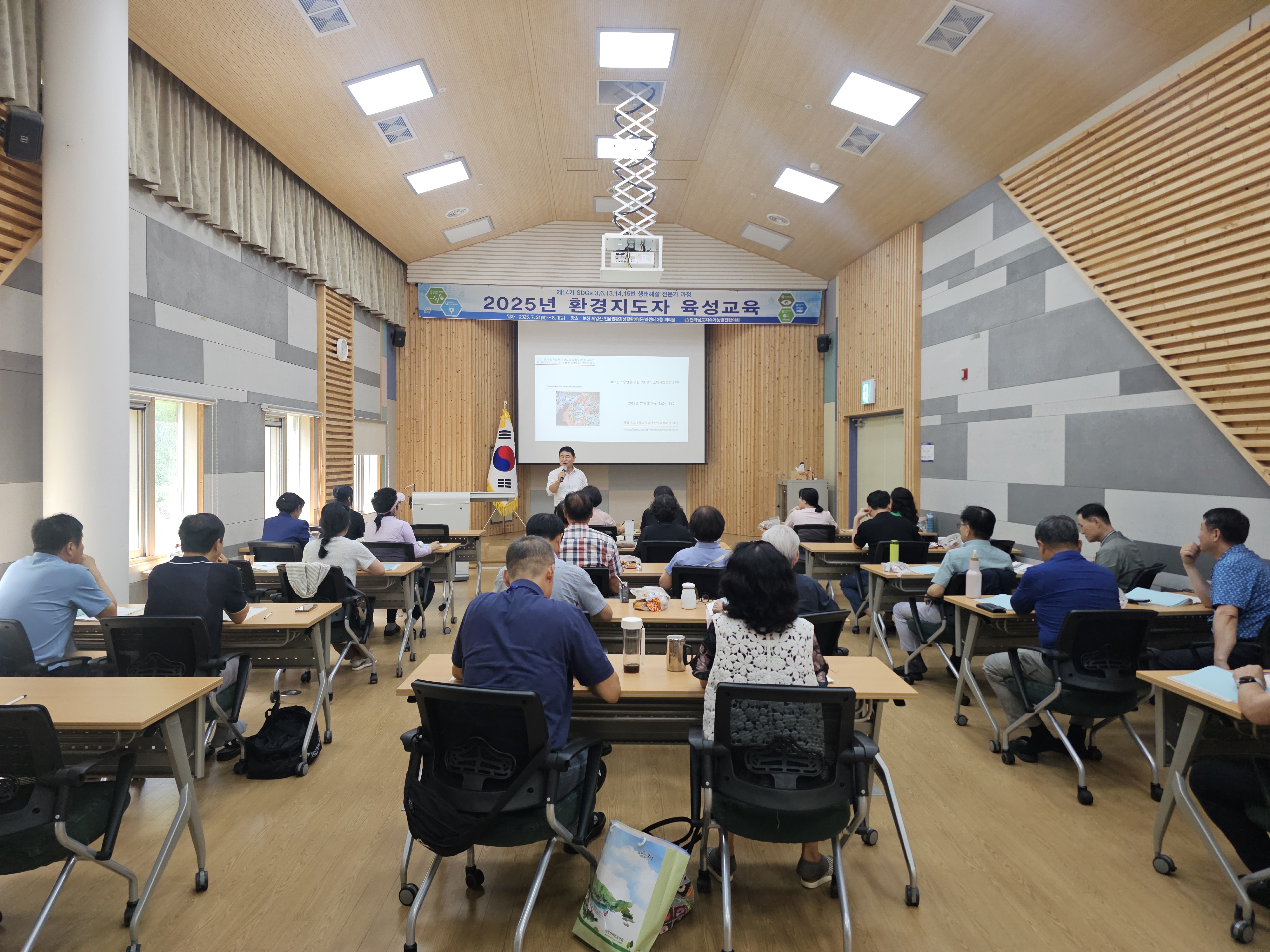 1. 개요 •운영목표 : 지속가능발전(SDGs) 환경교육 및 다양한 생태 체험 활동을 진행할 수 있는 지도자 양성과 각 지역에 필요한 교육을 지도하고 관련 인력의 전문성 신장을 위함. •교육기간 : 2025.07.31(목)~08.01(금)/1박2일 •교육장소 : 전남권환경성질환 예방관리센터 3층 회의실(전남 보성군 웅치면 대산길 329-126) •대 상 : 전라남도 22개 시·군 내 지속가능발전목표(SDGs) 환경보존 이행을 목표로 시·도민, 단체나 기관 공모 •인 원 : 30명 내외 •교육내용 - 1강. 해양환경변화와 영향 - 2강. 탄소중립,숲과의 약속 - 3강. 2050 탄소중립을 위한 탈플라스틱 사회로의 전환 - 4강. 지속가능성 위기의 극복을 위한 과제 - 5강. 온난화와 미래지구의 변화 - 6강. 생태사회 전환 ※ 6강 강의 후 30문항 평가, 60% 이수자 수료 2. 효과 환경지도자 육성 교육을 통해 친환경적인 가치관을 정립하고 전라남도 환경교육의 활성화를 이끌어 냄 3. 추진실적 ‘12 1기 자연생태해설사 과정(2012.08.24~26) - 수료생24명 ‘13 2기 자연생태해설사 과정(2013.09.26~28) - 수료생18명 '14 3기 자연생태해설사 과정(2014.09.25~27) - 수료생20명 ‘15 4기 자연생태해설사 과정(2015.10.29~30) - 수료생20명 ‘16 5기 자연생태해설사 과정(2016.06.23~24) - 수료생20명 ‘17 6기 자연생태해설사 과정(2017.07.20~21) - 수료생25명 ‘18 7기 자연생태해설사 과정(2018.07.24~25) - 수료생25명 ‘19 8기 자연생태해설사 과정(2019.07.25~26) - 수료생27명 ‘20 9기 자연생태해설사 과정(2020.10.15~16) - 수료생28명 ‘21 10기 자연생태해설사 과정(2021.08.31~01) - 수료생27명 ‘22 11기 자연생태해설사 과정(2022.09.01~02) - 수료생26명 ‘23 12기 자연생태해설사 과정(2023.08.31~01) - 수료생26명 '24 13기 자연생태해설사 과정(2024.09.05~06) - 수료생26명 '25 14기 자연생태해설사 과정(2025.07.31~08.01) - 수료생 24명