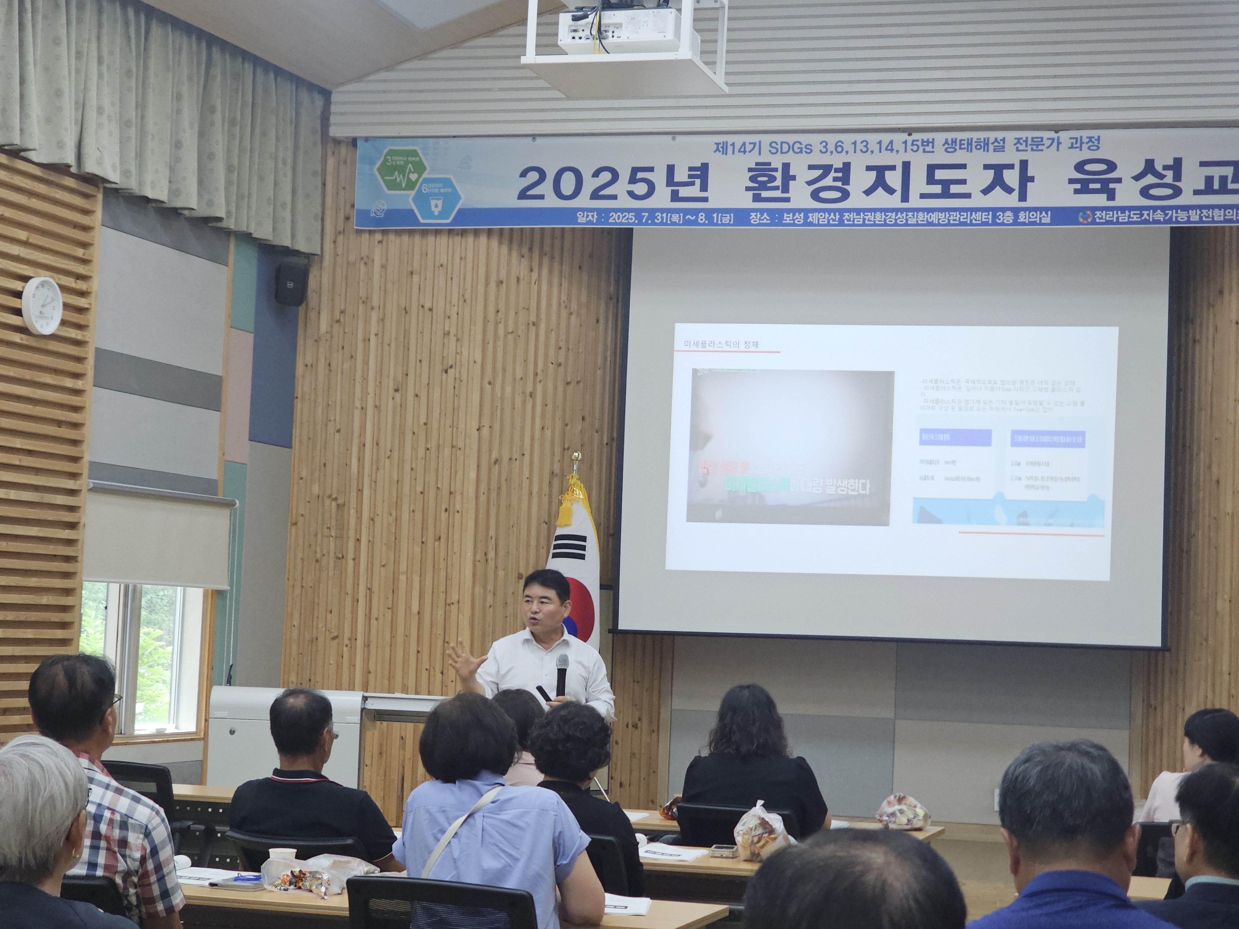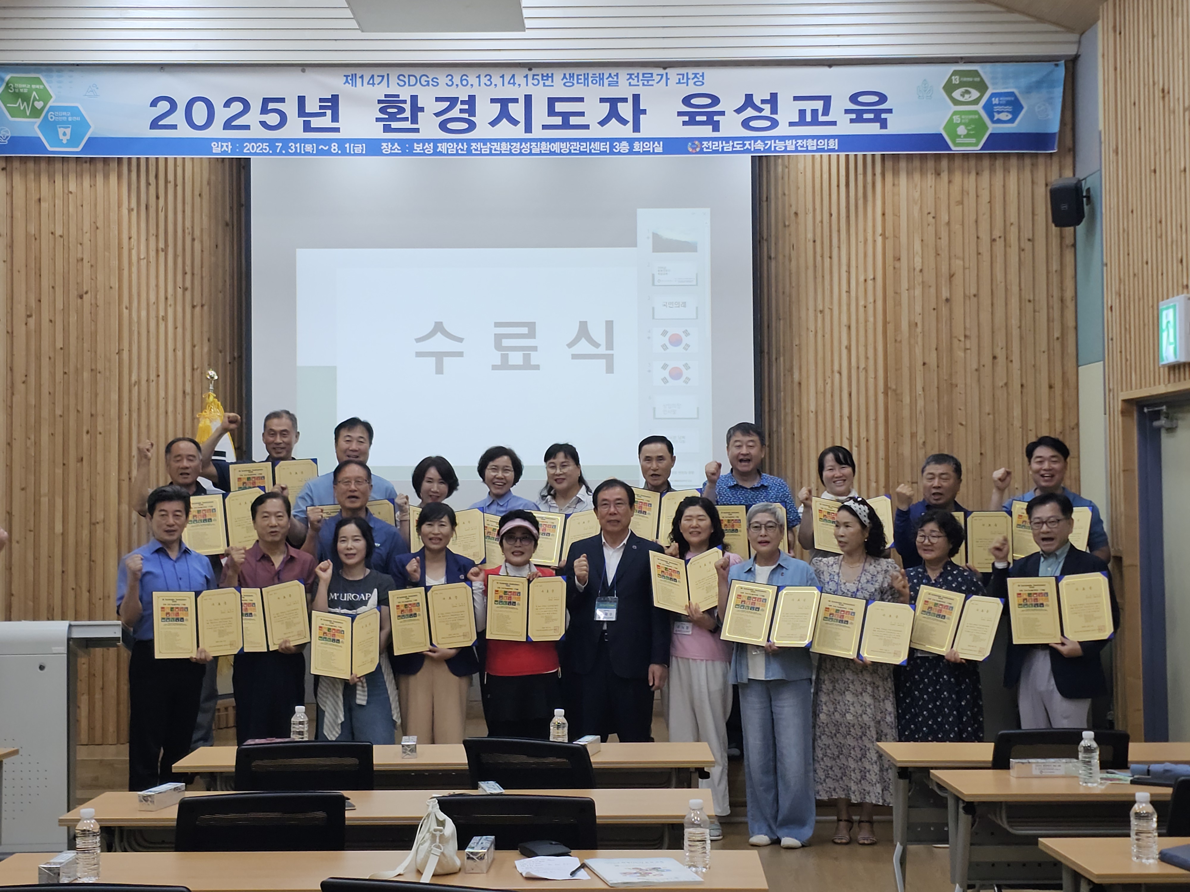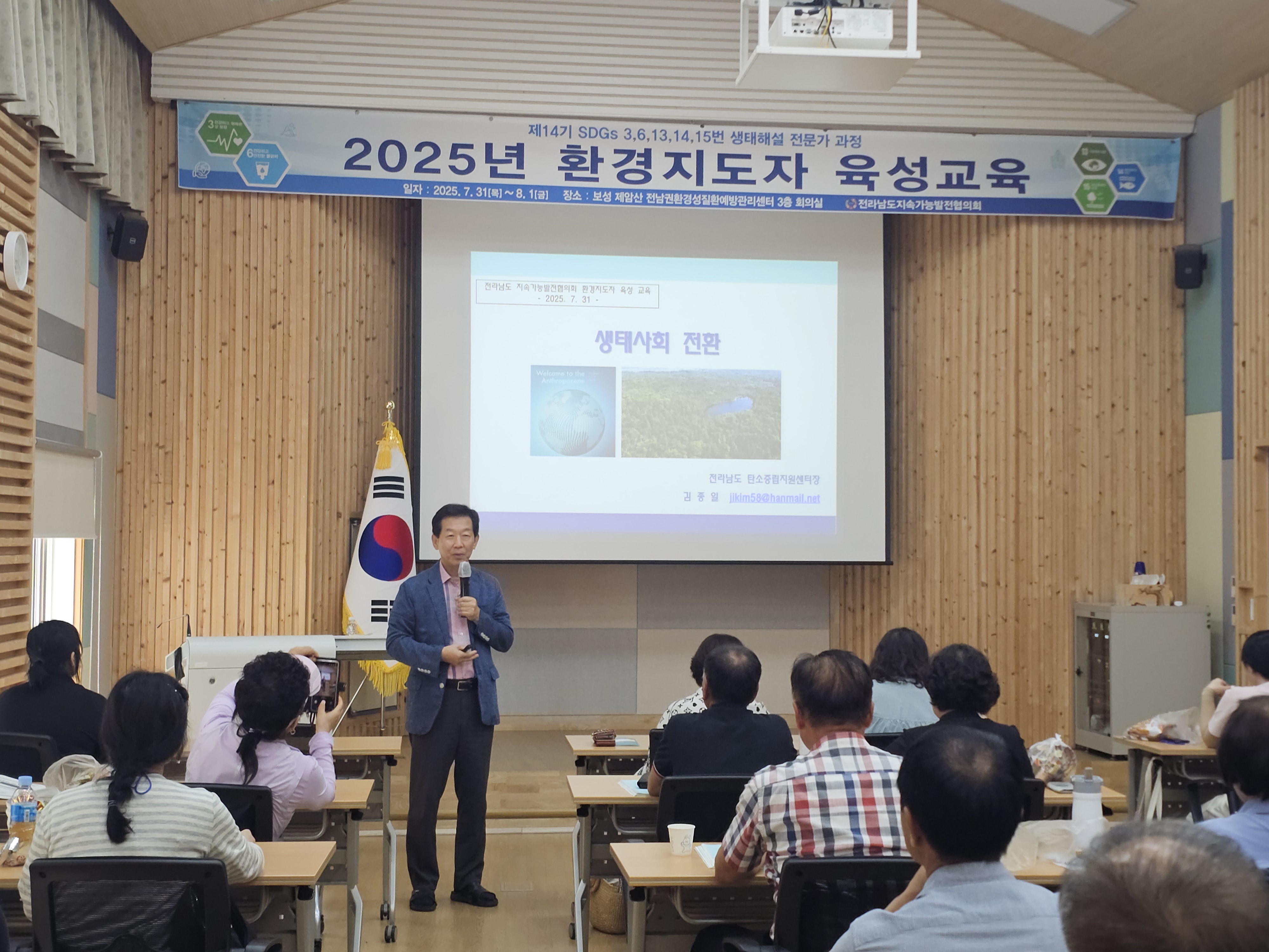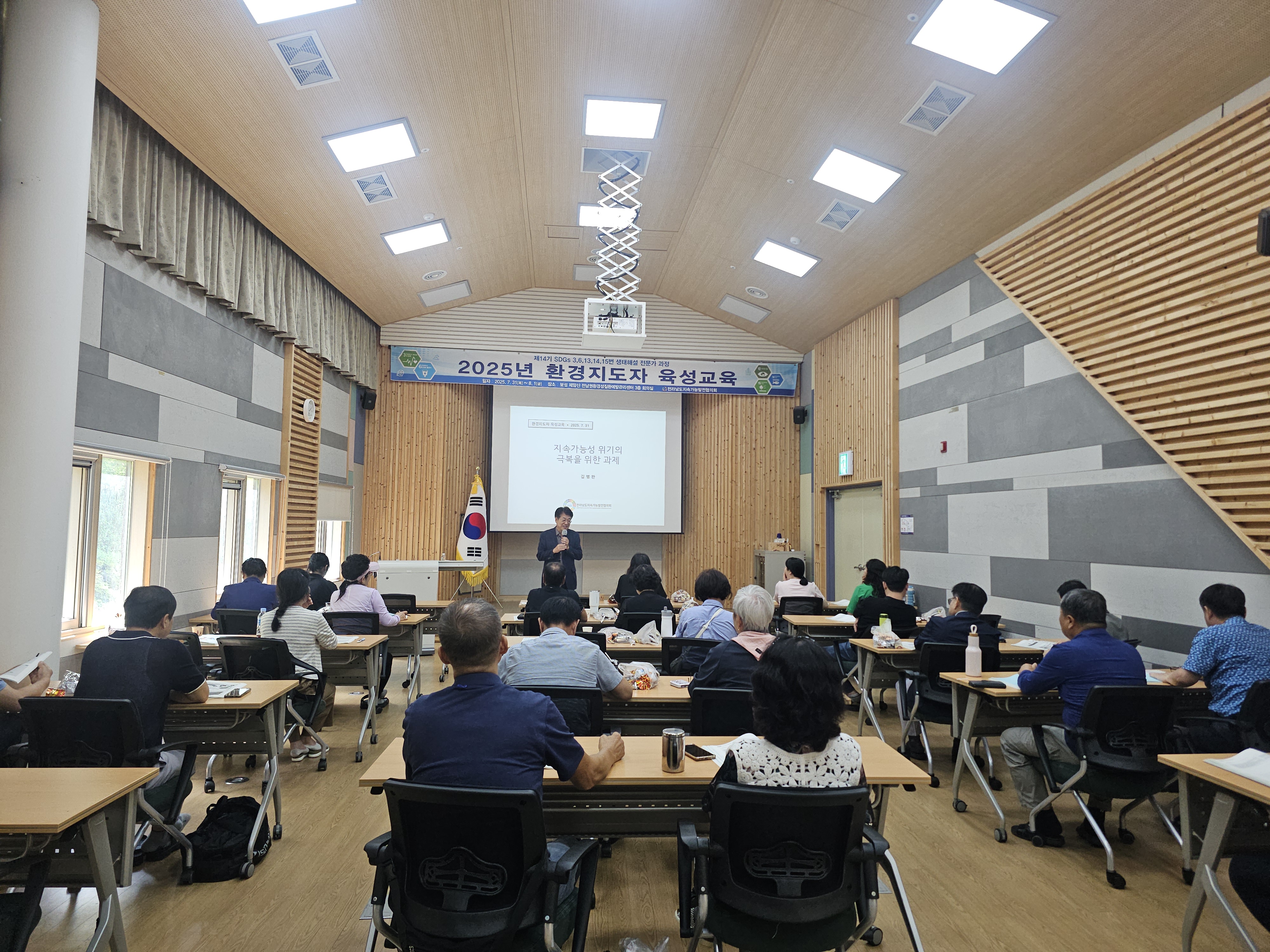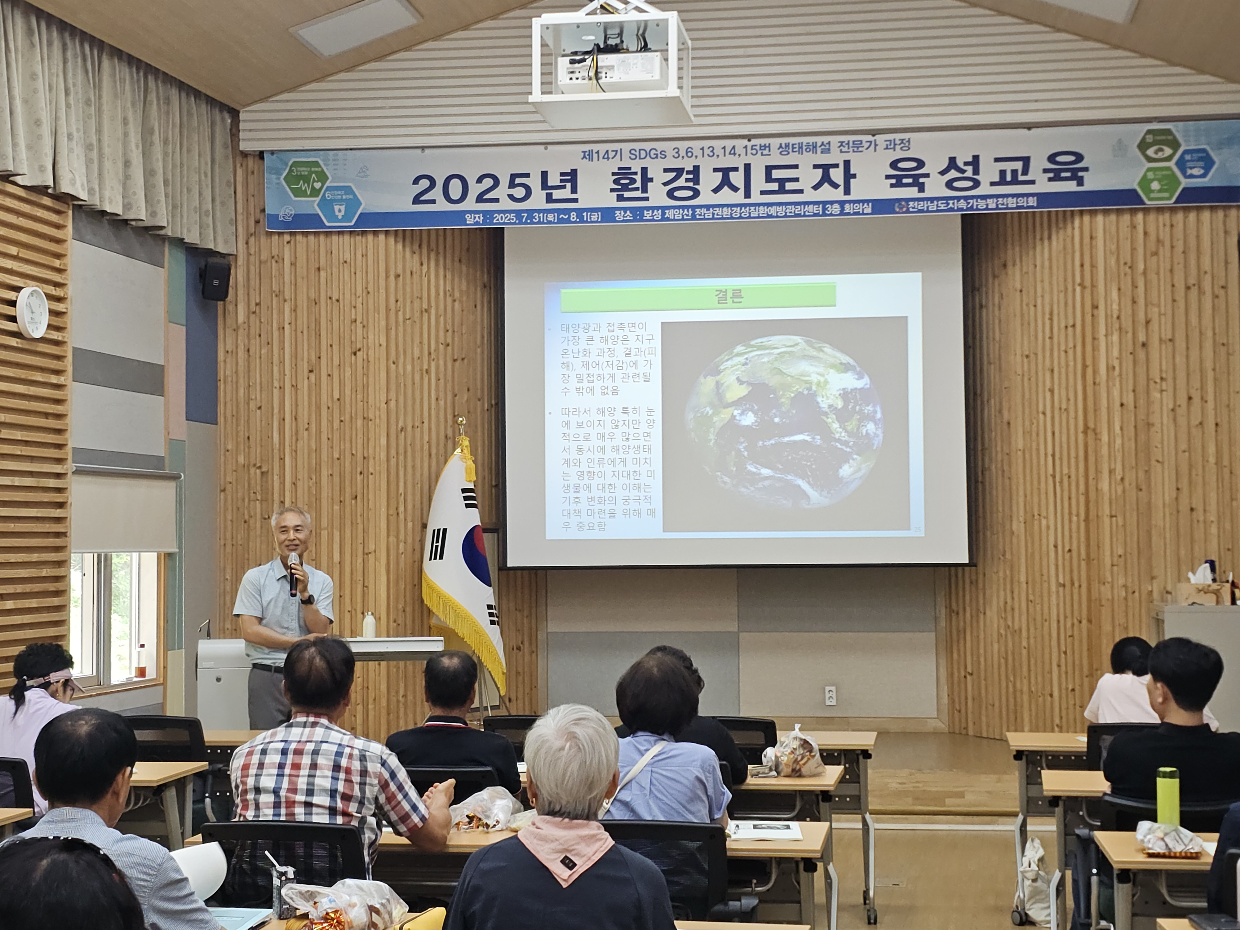 1. 개요 •운영목표 : 지속가능발전(SDGs) 환경교육 및 다양한 생태 체험 활동을 진행할 수 있는 지도자 양성과 각 지역에 필요한 교육을 지도하고 관련 인력의 전문성 신장을 위함. •교육기간 : 2025.07.31(목)~08.01(금)/1박2일 •교육장소 : 전남권환경성질환 예방관리센터 3층 회의실(전남 보성군 웅치면 대산길 329-126) •대 상 : 전라남도 22개 시·군 내 지속가능발전목표(SDGs) 환경보존 이행을 목표로 시·도민, 단체나 기관 공모 •인 원 : 30명 내외 •교육내용 - 1강. 해양환경변화와 영향 - 2강. 탄소중립,숲과의 약속 - 3강. 2050 탄소중립을 위한 탈플라스틱 사회로의 전환 - 4강. 지속가능성 위기의 극복을 위한 과제 - 5강. 온난화와 미래지구의 변화 - 6강. 생태사회 전환 ※ 6강 강의 후 30문항 평가, 60% 이수자 수료 2. 효과 환경지도자 육성 교육을 통해 친환경적인 가치관을 정립하고 전라남도 환경교육의 활성화를 이끌어 냄 3. 추진실적 ‘12 1기 자연생태해설사 과정(2012.08.24~26) - 수료생24명 ‘13 2기 자연생태해설사 과정(2013.09.26~28) - 수료생18명 '14 3기 자연생태해설사 과정(2014.09.25~27) - 수료생20명 ‘15 4기 자연생태해설사 과정(2015.10.29~30) - 수료생20명 ‘16 5기 자연생태해설사 과정(2016.06.23~24) - 수료생20명 ‘17 6기 자연생태해설사 과정(2017.07.20~21) - 수료생25명 ‘18 7기 자연생태해설사 과정(2018.07.24~25) - 수료생25명 ‘19 8기 자연생태해설사 과정(2019.07.25~26) - 수료생27명 ‘20 9기 자연생태해설사 과정(2020.10.15~16) - 수료생28명 ‘21 10기 자연생태해설사 과정(2021.08.31~01) - 수료생27명 ‘22 11기 자연생태해설사 과정(2022.09.01~02) - 수료생26명 ‘23 12기 자연생태해설사 과정(2023.08.31~01) - 수료생26명 '24 13기 자연생태해설사 과정(2024.09.05~06) - 수료생26명 '25 14기 자연생태해설사 과정(2025.07.31~08.01) - 수료생 24명