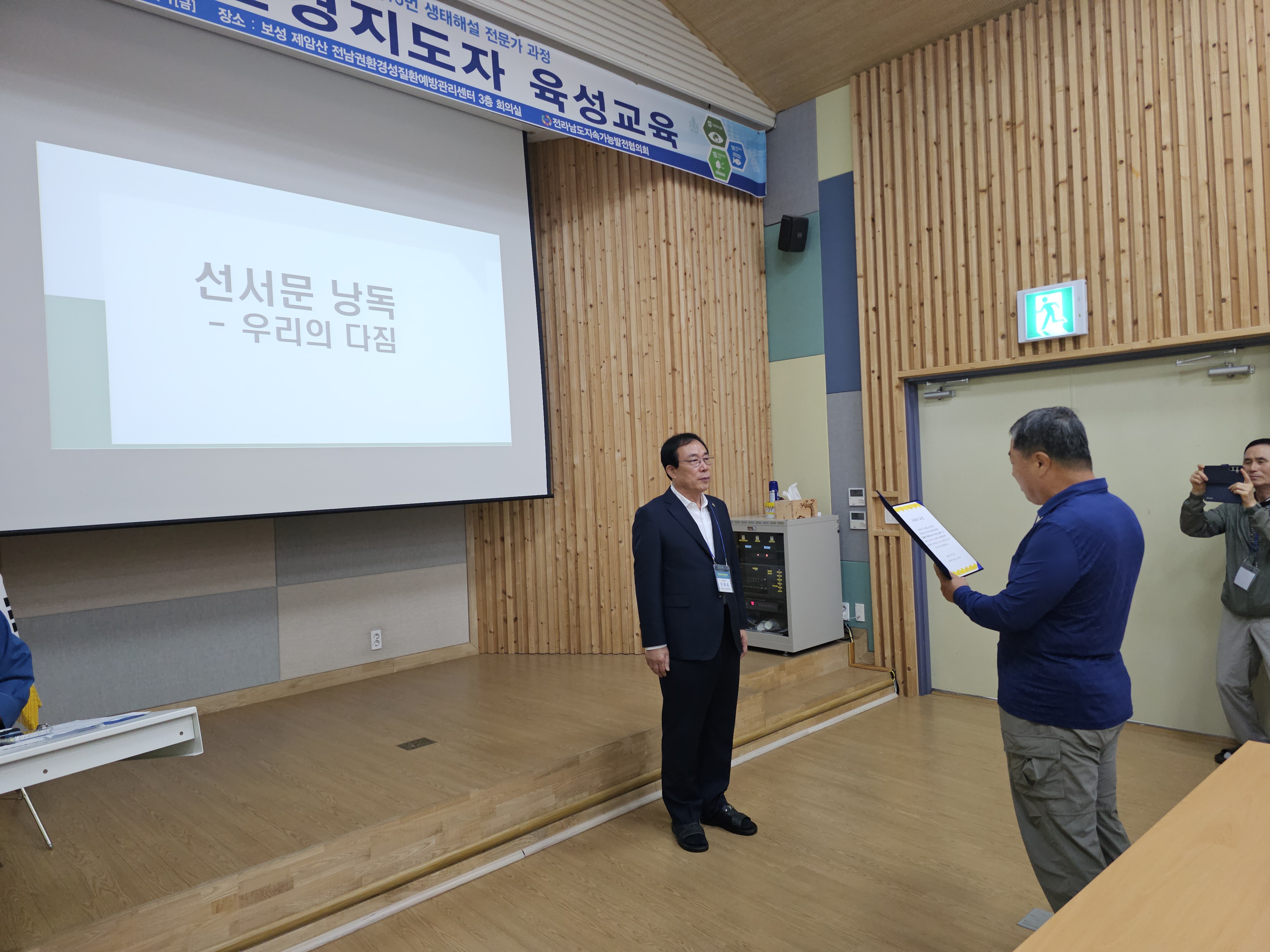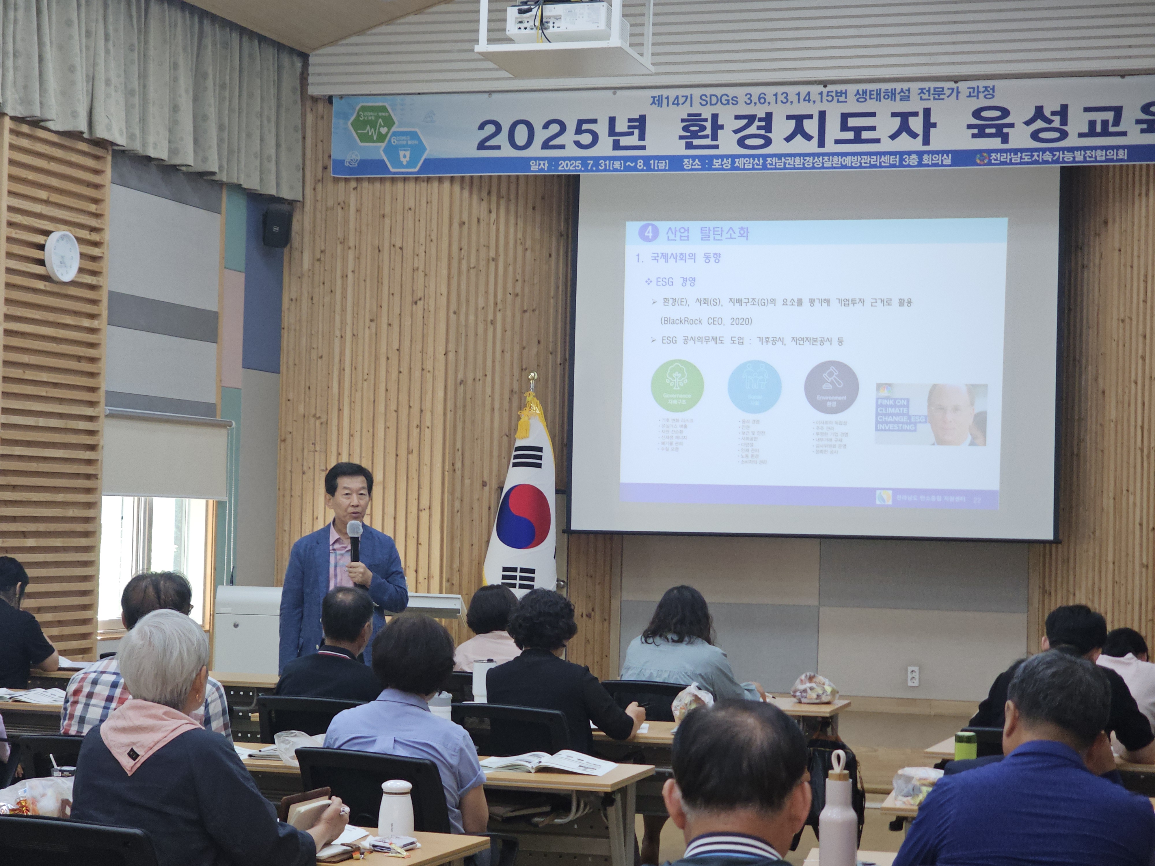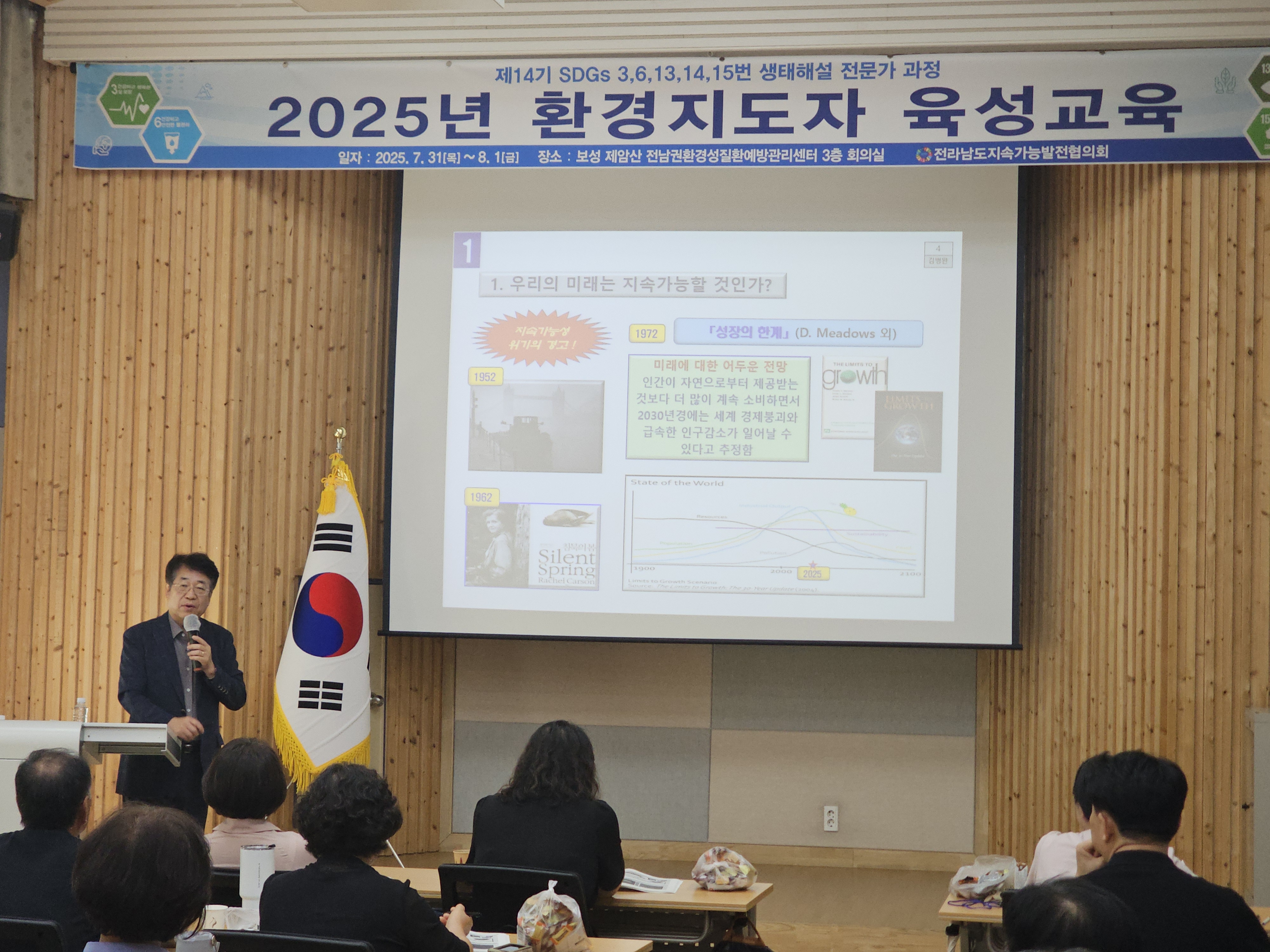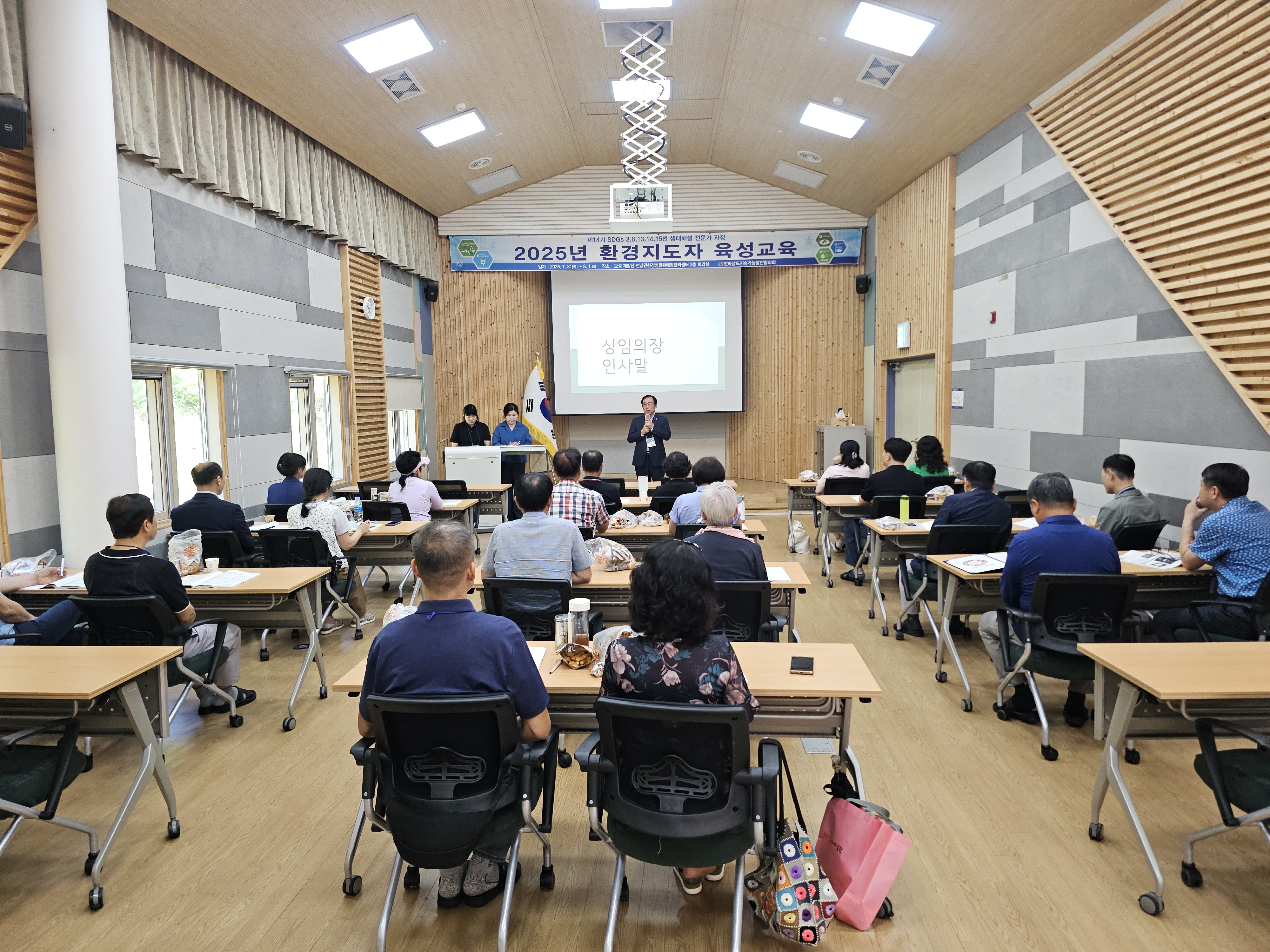 1. 개요 •운영목표 : 지속가능발전(SDGs) 환경교육 및 다양한 생태 체험 활동을 진행할 수 있는 지도자 양성과 각 지역에 필요한 교육을 지도하고 관련 인력의 전문성 신장을 위함. •교육기간 : 2025.07.31(목)~08.01(금)/1박2일 •교육장소 : 전남권환경성질환 예방관리센터 3층 회의실(전남 보성군 웅치면 대산길 329-126) •대 상 : 전라남도 22개 시·군 내 지속가능발전목표(SDGs) 환경보존 이행을 목표로 시·도민, 단체나 기관 공모 •인 원 : 30명 내외 •교육내용 - 1강. 해양환경변화와 영향 - 2강. 탄소중립,숲과의 약속 - 3강. 2050 탄소중립을 위한 탈플라스틱 사회로의 전환 - 4강. 지속가능성 위기의 극복을 위한 과제 - 5강. 온난화와 미래지구의 변화 - 6강. 생태사회 전환 ※ 6강 강의 후 30문항 평가, 60% 이수자 수료 2. 효과 환경지도자 육성 교육을 통해 친환경적인 가치관을 정립하고 전라남도 환경교육의 활성화를 이끌어 냄 3. 추진실적 ‘12 1기 자연생태해설사 과정(2012.08.24~26) - 수료생24명 ‘13 2기 자연생태해설사 과정(2013.09.26~28) - 수료생18명 '14 3기 자연생태해설사 과정(2014.09.25~27) - 수료생20명 ‘15 4기 자연생태해설사 과정(2015.10.29~30) - 수료생20명 ‘16 5기 자연생태해설사 과정(2016.06.23~24) - 수료생20명 ‘17 6기 자연생태해설사 과정(2017.07.20~21) - 수료생25명 ‘18 7기 자연생태해설사 과정(2018.07.24~25) - 수료생25명 ‘19 8기 자연생태해설사 과정(2019.07.25~26) - 수료생27명 ‘20 9기 자연생태해설사 과정(2020.10.15~16) - 수료생28명 ‘21 10기 자연생태해설사 과정(2021.08.31~01) - 수료생27명 ‘22 11기 자연생태해설사 과정(2022.09.01~02) - 수료생26명 ‘23 12기 자연생태해설사 과정(2023.08.31~01) - 수료생26명 '24 13기 자연생태해설사 과정(2024.09.05~06) - 수료생26명 '25 14기 자연생태해설사 과정(2025.07.31~08.01) - 수료생 24명